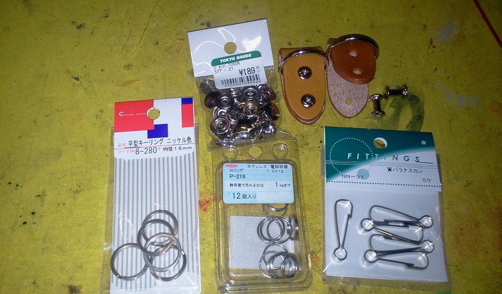 右上の2つは、「皮吊環」(カワツリカン)というもので、本来はカバンの左右に付けて肩下げベルトをつける部品を転用。