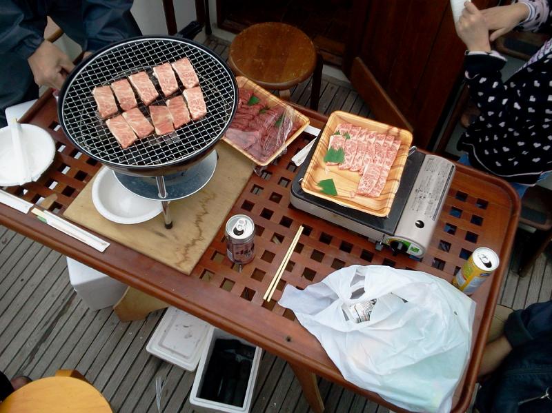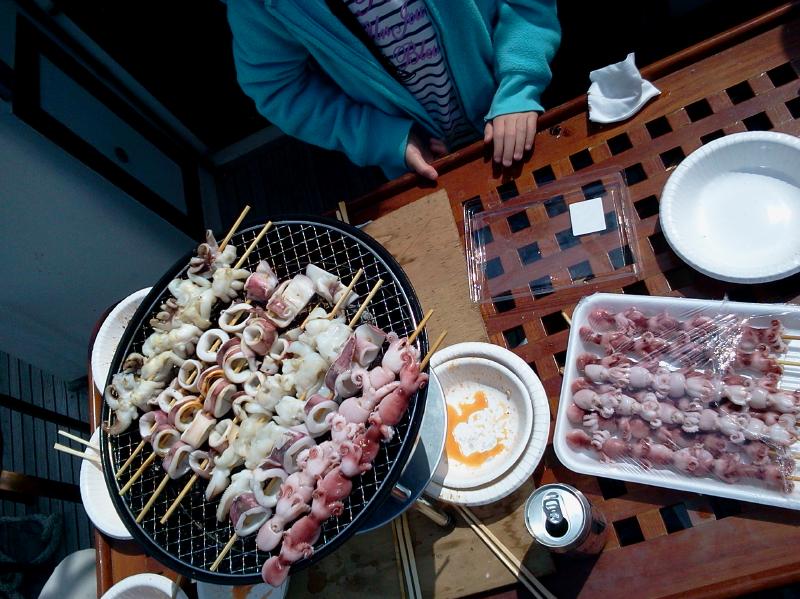 着いたら、「花より団子」、早速、肉やイカ・海老・ホタテも焼き始めます。