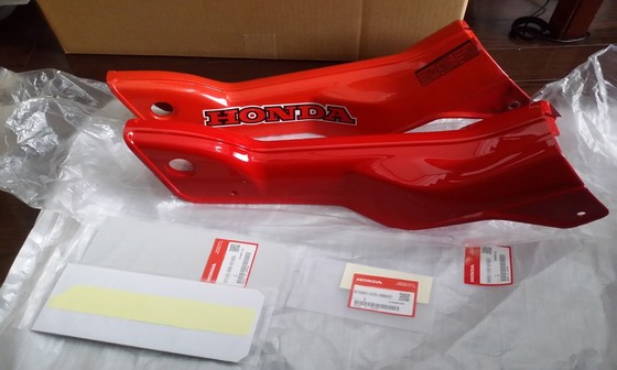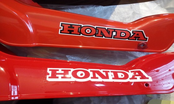 なかなか写真では色の見分けが厳しいのですが、国内版はオレンジに近い赤、海外版は消防車のような深紅の赤、つまりまっかっかなんですよ。ステッカーも海外版はHONDAの文字が白。